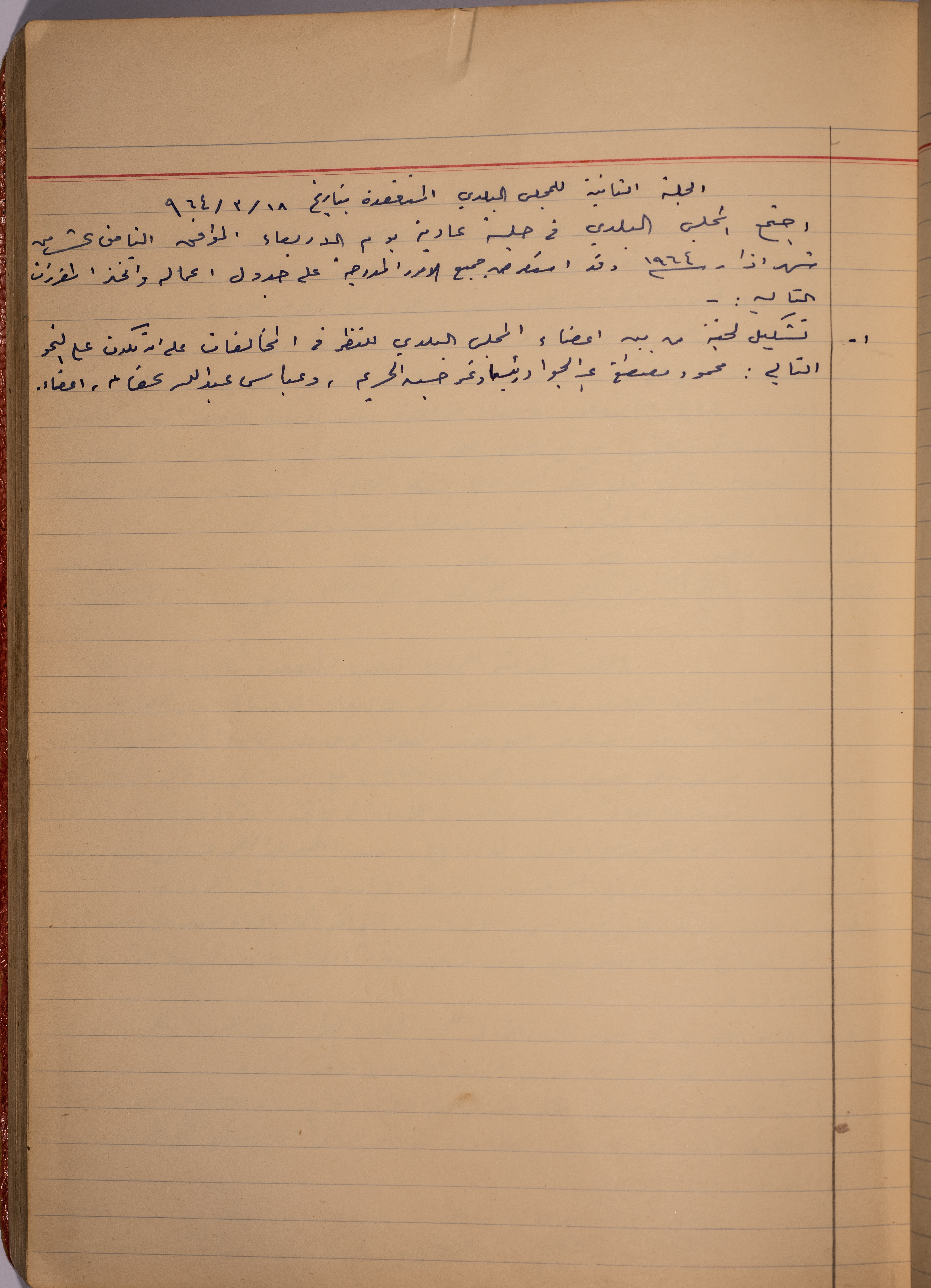 مسودة محضر جلسة مجلس بلدية سلفيت رقم 2، المعقودة بتاريخ 18 آذار 1964، يظهر فيها قرار واحد يقضي بتشكيل لجنة من أعضاء المجلس للنظر في المخالفات المقدمة للبلدية.