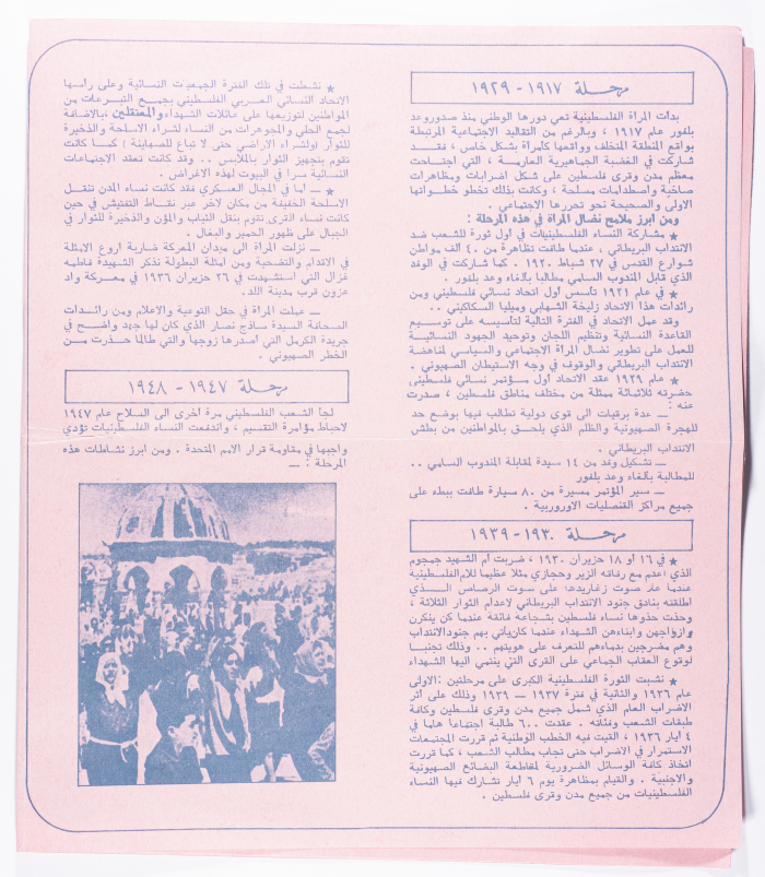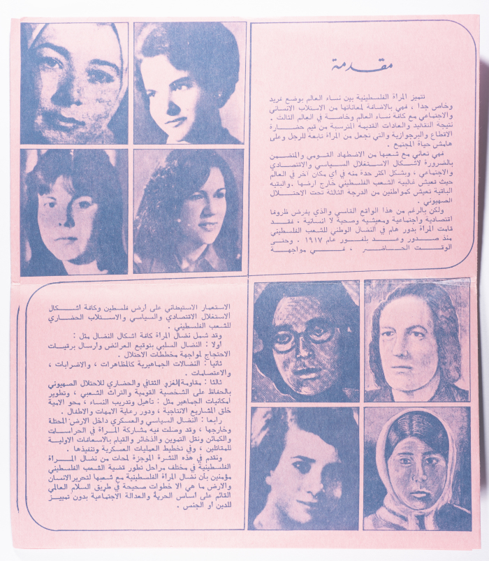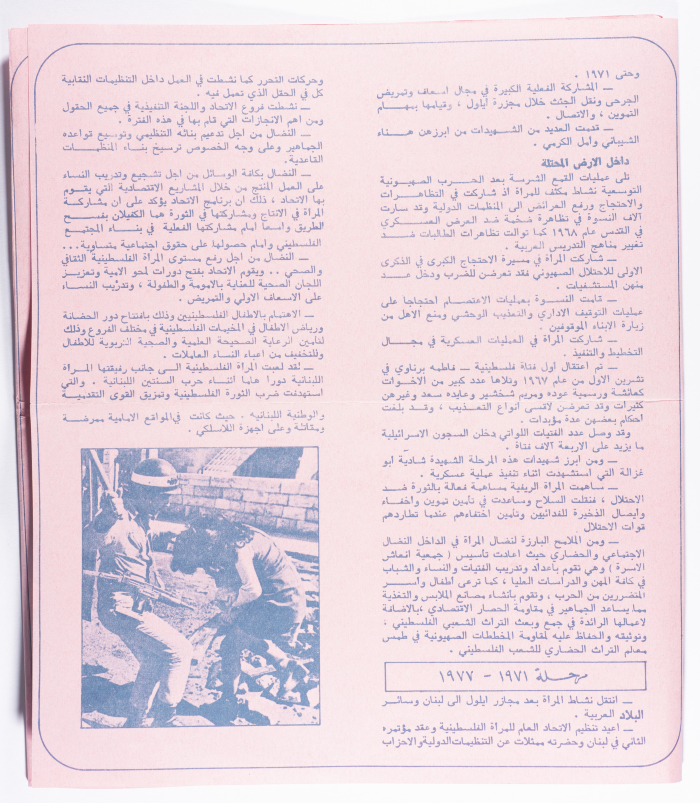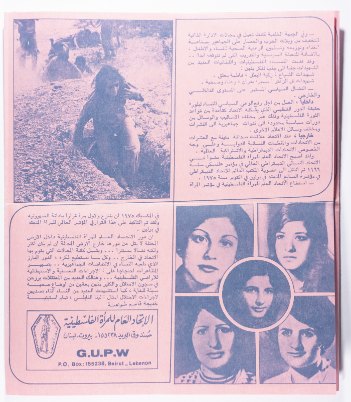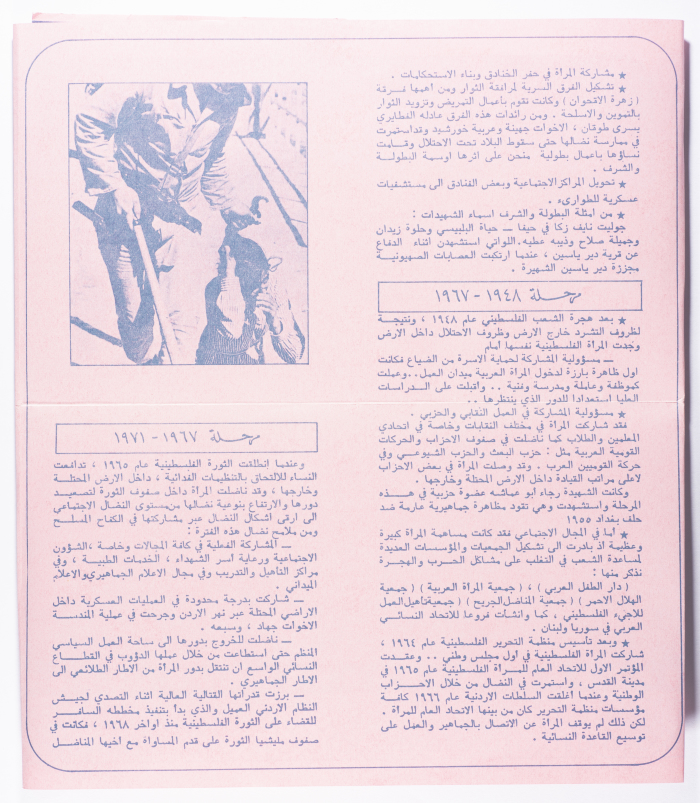 Printed in Arabic, this brochure entitled "Glimpses of the Struggle of Palestinian Women" was published in the General Union of Palestinian Women Magazine in Lebanon.