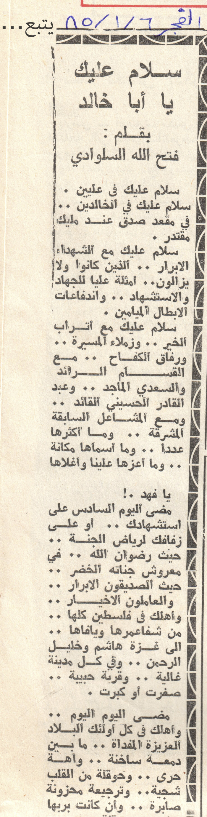 مادة مطبوعة باللغة العربية وهي عبارة عن قصاصة من جريدة الفجر بقلم فتح الله السلوادي تحتوي على مقالة تتحدث عن الشهيد فهد القواسمي عام 1985 ، وُجِدت في مجموعة فهد القواسمي.