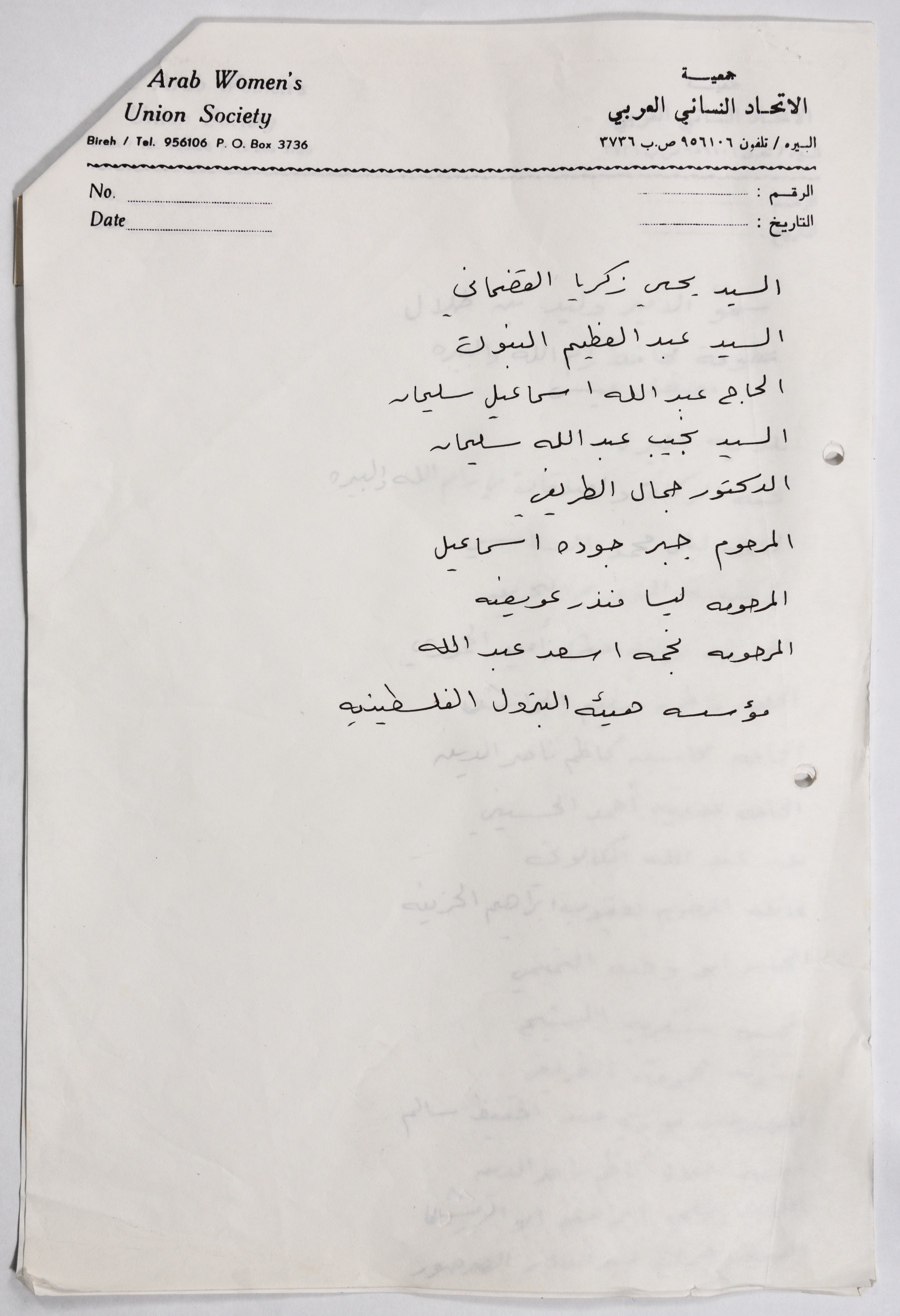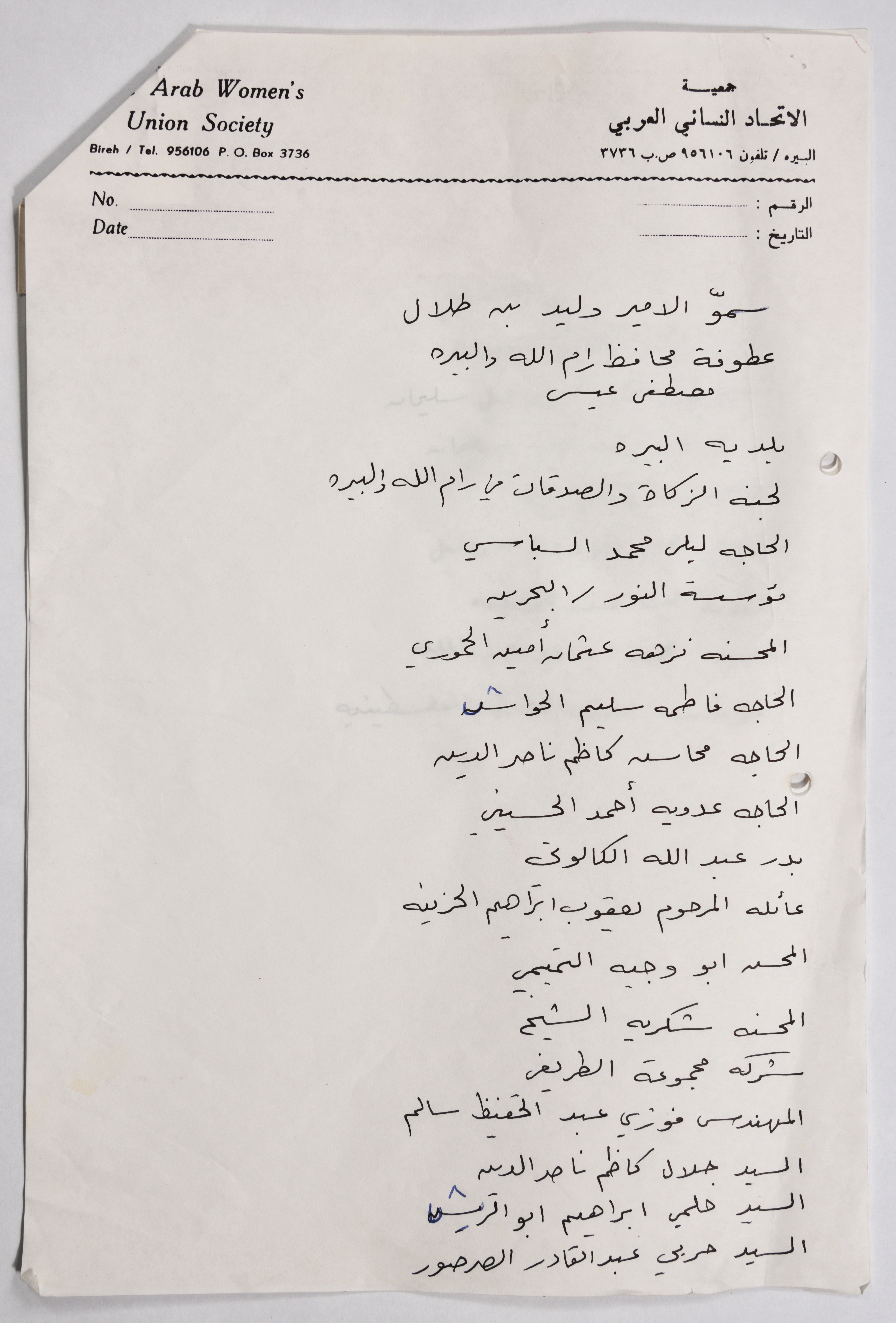 وثيقة تعود لجمعية الاتحاد النسائي العربي - البيرة تحوي قائمة أسماء