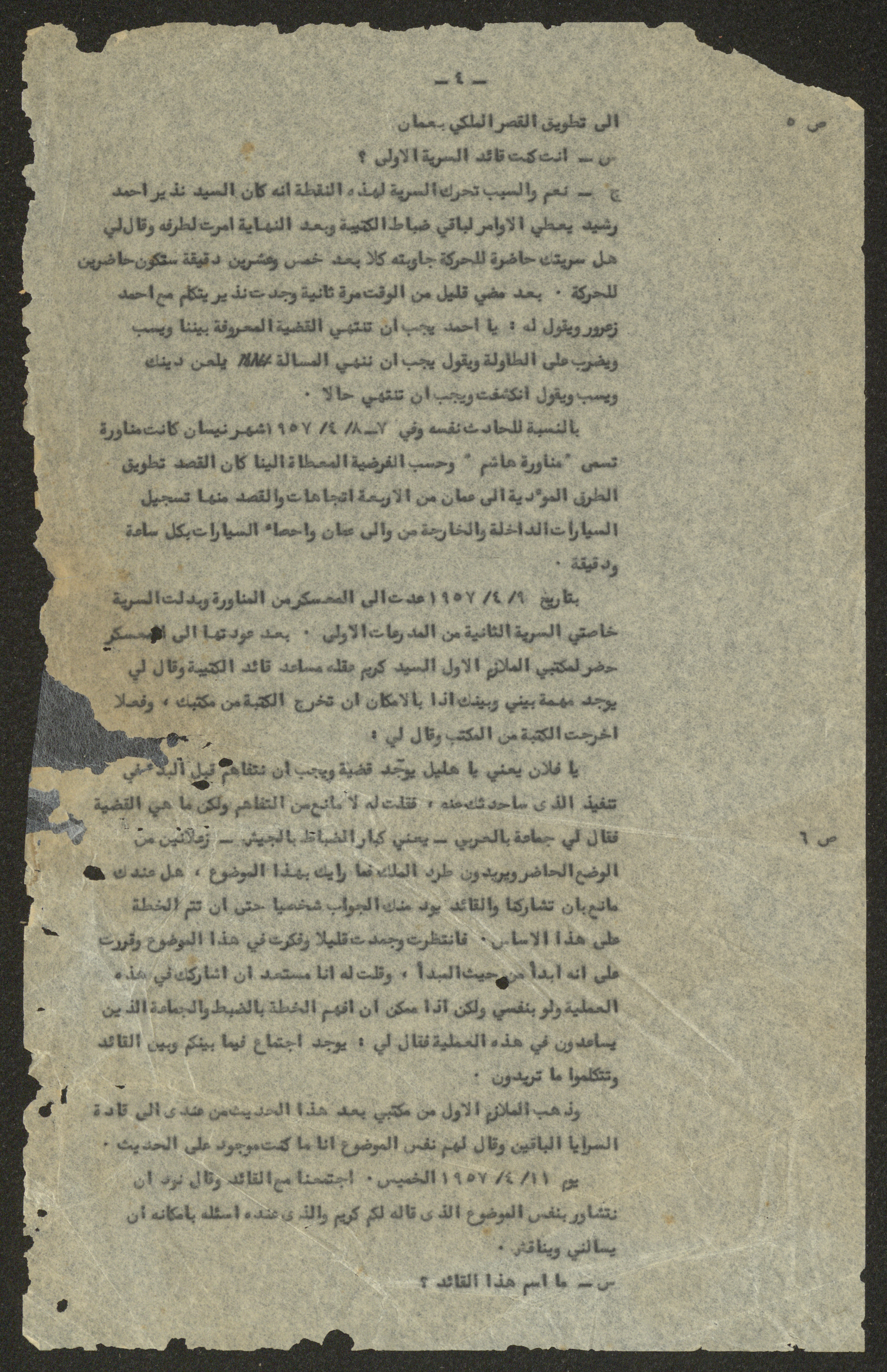 Printed in Arabic, this archival item documents the proceedings of the 2nd session of the Court Martial on the coup attempt against the King of Jordan which was held on Tuesday, 30 July 1957 at the King Abdullah II Air Base, in the presence of Colonel “Abed el-Karim al-Barghouti” and Colonel “Ahmad Baslan” along with “Taher Ashihabi and “Adnan Biyoun”, together, they did the secretary related work. The Defense Committee included the following attorneys; Anwar Nusseibeh, Fuad Abd el-Hadi, Hasan Habib Hawwa and Azziz Shihadeh; whereas the session was inaugurated by the Chief Colonel Major “Aukash Azzain” who addressed a question to the witnesses standing before him and they are Major General “Muhammad al-Mayytah”, “Maen Abu Nowwar”, “Naywf al-Hadid”, “Turki el-Hindawi and “Karim Aqleh” and others; each was asked wither they were guilty or not, however, they all denied. Once again, Chief Colonel Major “Aukash Azzain” called for the Representative of the General Prosecution; Colonel “Muhammad Assadi” in his capacity as a representative who, on his behalf, invited the witness; the Second Lieutenant “Halil Salameh” Leader of the First Company at the 1st Brigade of the Armored Vehicles to present himself before the court; where he was asked to deliver his name, age, military rank and his familiarity of the suspects and wither they are close or enemies in addition to the type of his weapon, furthermore, he answered a question related to the day of the attempted coup on 13 April 1957, saying that the unites were involved with the 3rd Brigade and members of the artillery; as the two parties were involved in a shooting, afterwards the witness narrated the rest of the details to which and said that “Natheer Rasheed” spoke to them about the king; where, he described the king’s policy as unwanted in addition to a confirmation of his delivered during a meeting held on 11 April 1957 that they would round up the palace and expel the king, however, if they couldn’t do so, they would shoot him and they were faced by any of the president’s guards they would shoot from a 6-pounder gun. The rest of the testimony was continued until the session was resumed.