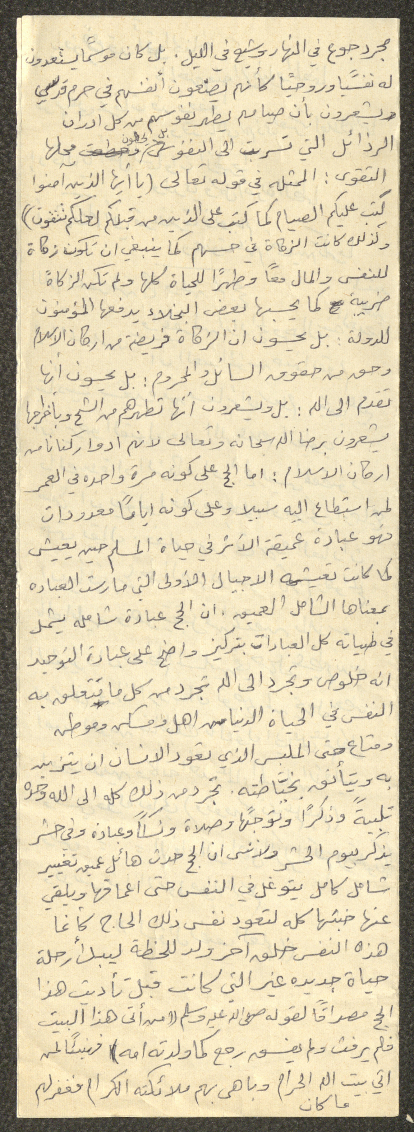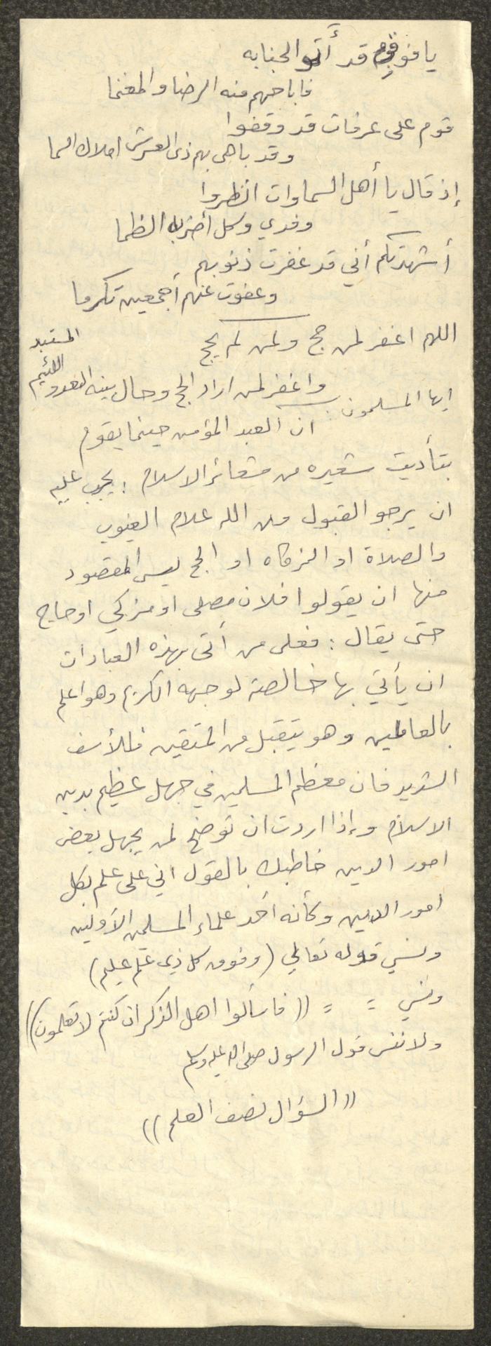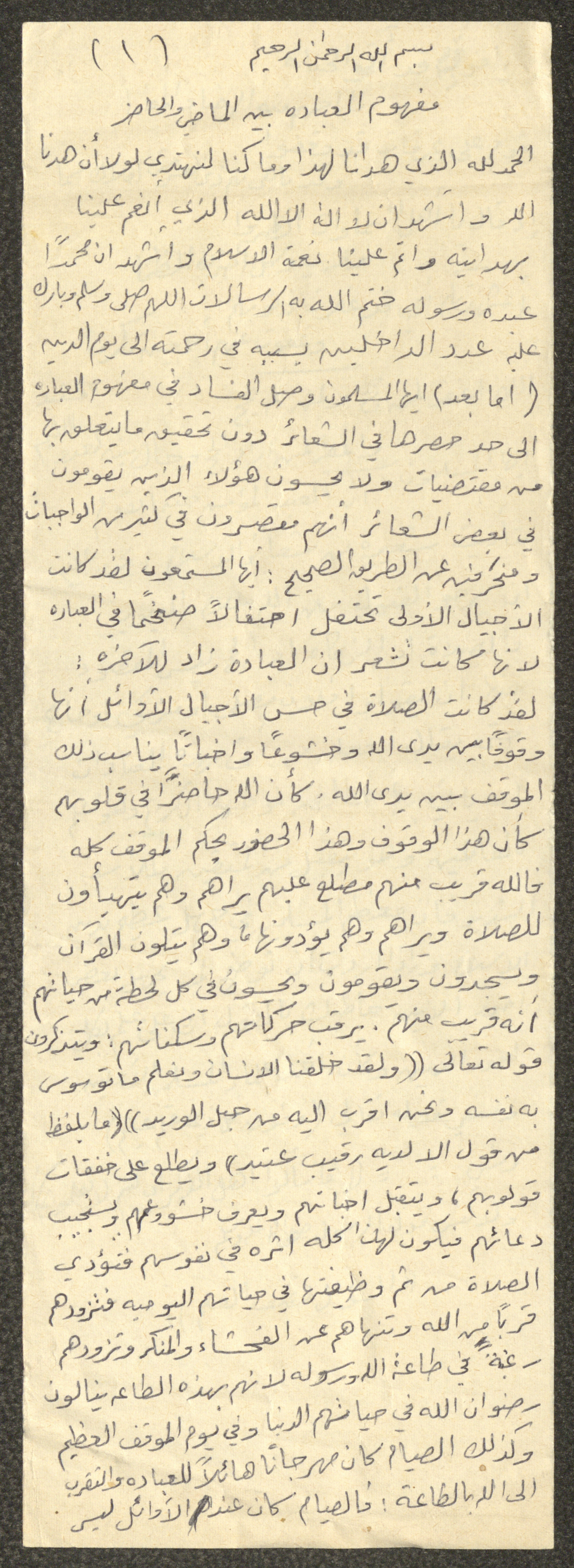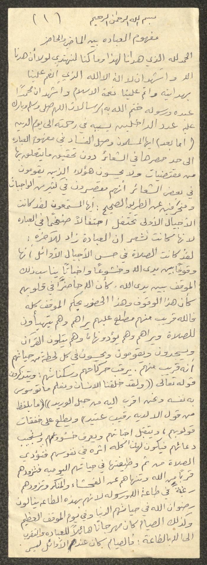 وثيقة مكتوبة بخط اليد تتضمن خطبة يوم الجمعة بعنوان "مفهوم العبادة بين الماضي والحاضر"، ألقاها الإمام معروف اشتية في مسجد في قرية سالم شمال شرق نابلس في ثمانينيات القرن العشرين. بدأها بحمد الله وتحدث فيها عن العبادة، ثم عقد مقارنة بين العبادة في الماضي والحاضر، مدعمًا خطبته بعدد من الآيات القرآنية والأحاديث النبوية.