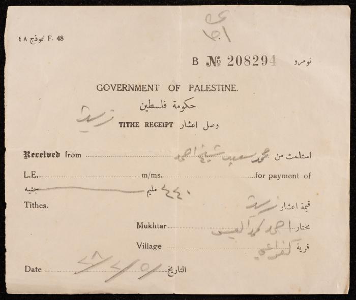"Tithe Receipt", by the Government of Palestine, 5 February 1928