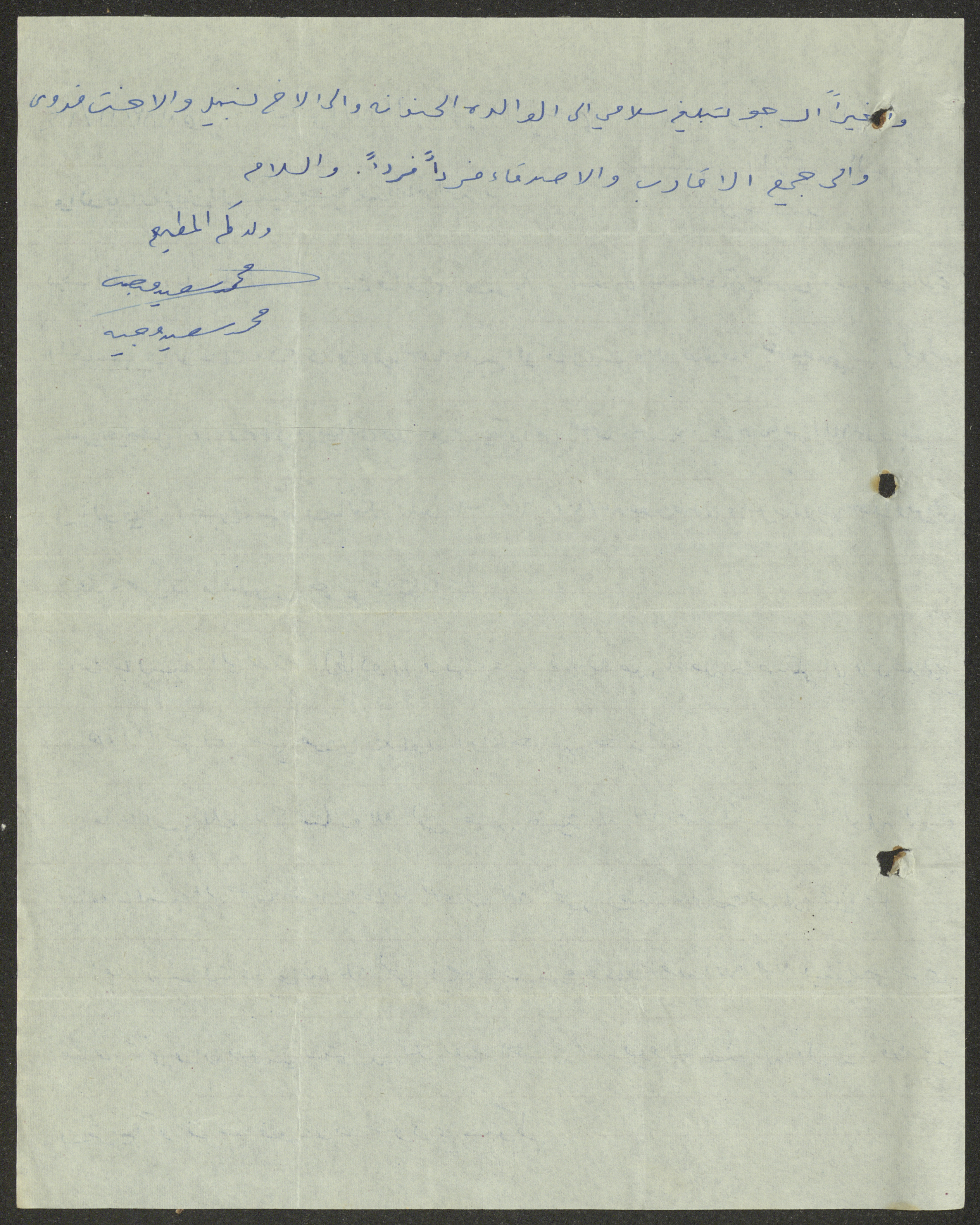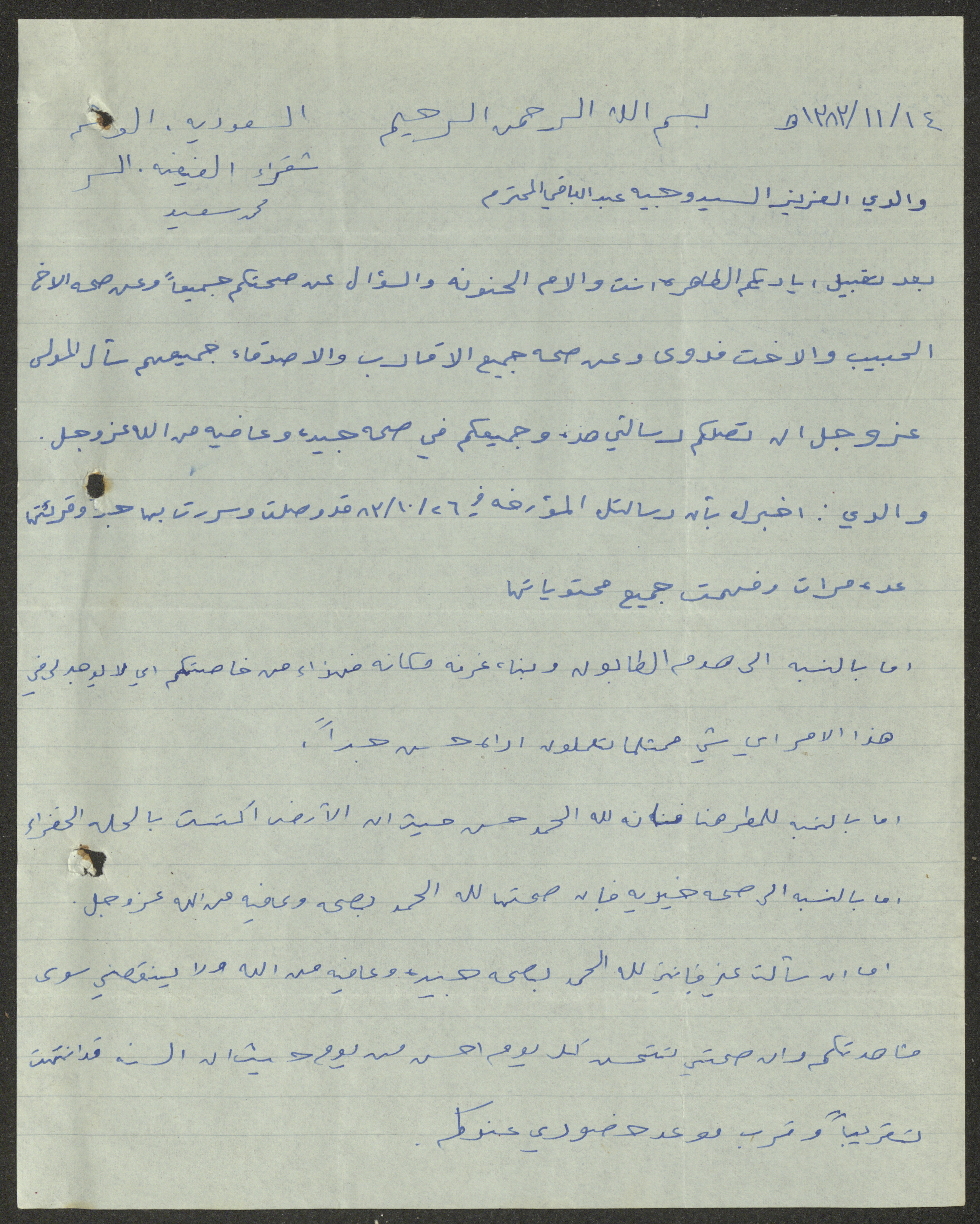 رسالة من صفحتين بخط اليد من محمد سعيد المقيم في المملكة العربية السعودية إلى وجيه عبد الباقي بتاريخ 28 آذار 1964، يسأل فيها عن صحة والده وعائلته وجديد أخبارهم، ويطمئن والده على سلامته وأحواله.