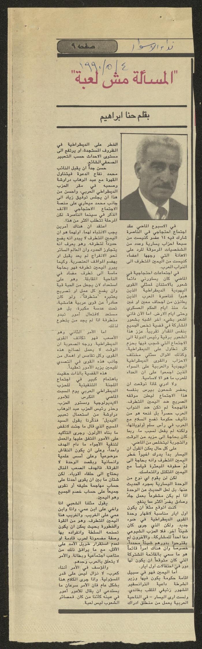 Issued on 4 May 1990, this document shows a newspaper clipping that includes an article by Hanna Ibrahim titled "This Is Not a Game".