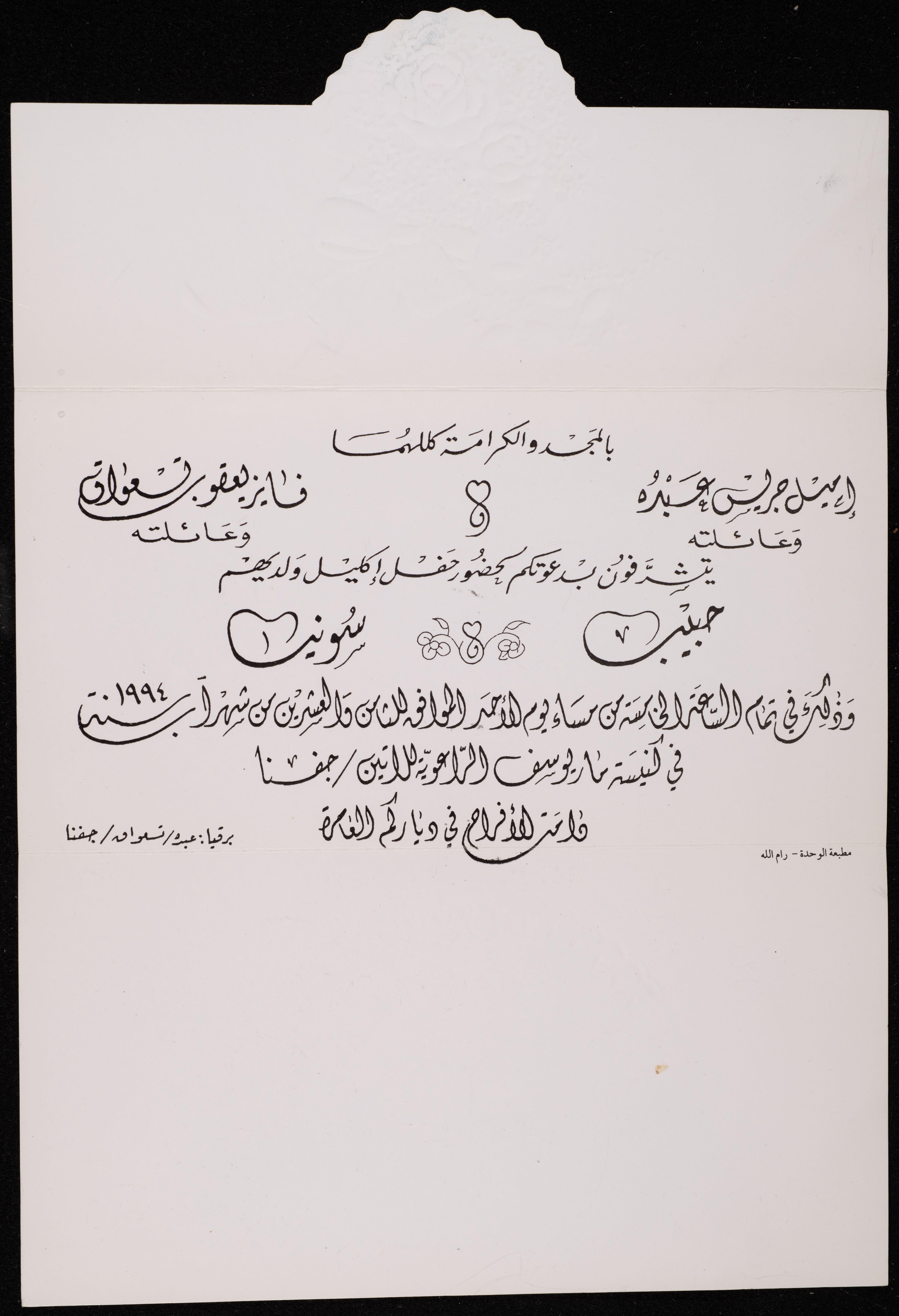 This document shows an invitation card for Habib Emile Jeries and Sonia Fayez Yacoub's wreath ceremony on 28 August 1994 at Saint Joseph's Latin Church in Jifna.