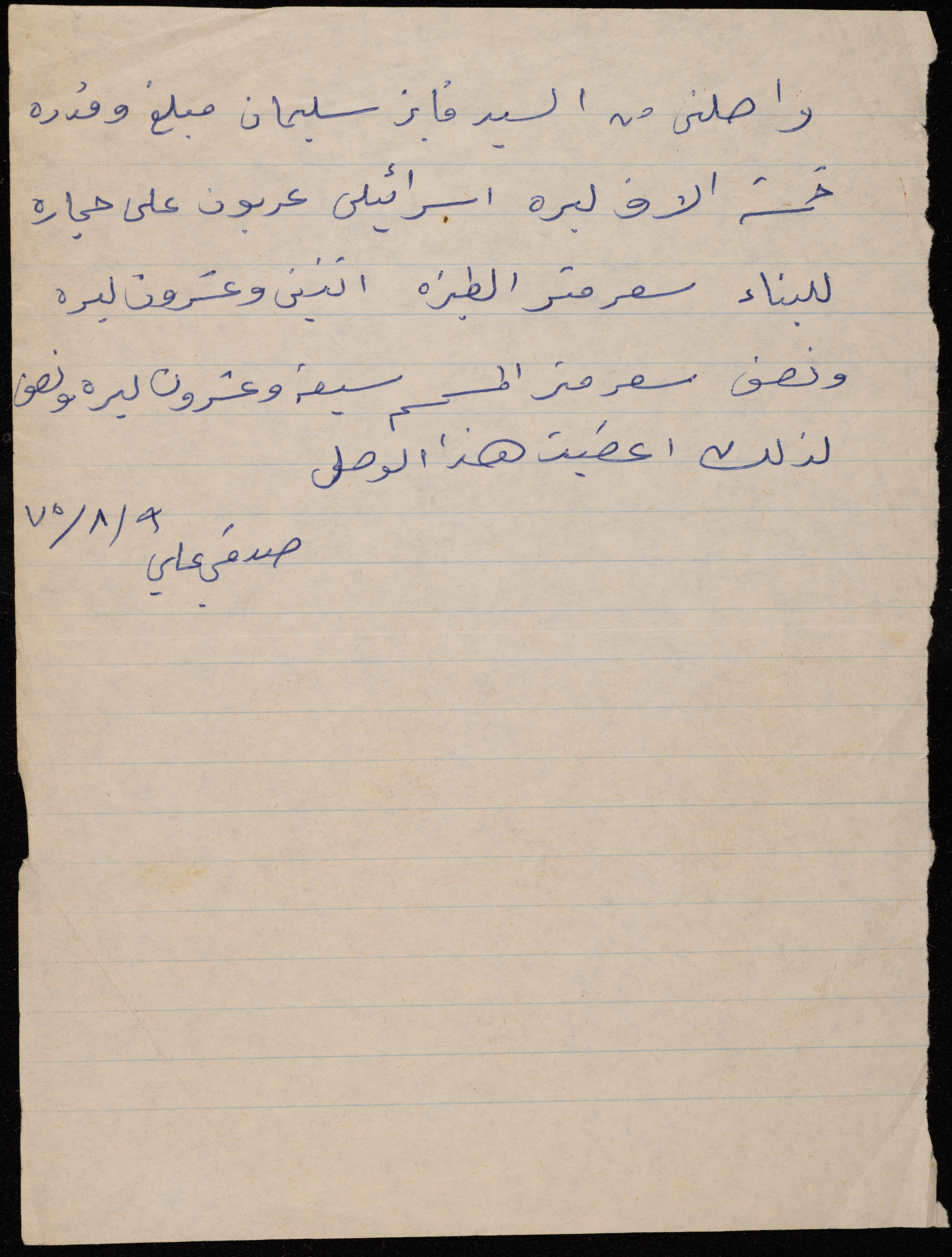 A Receipt from Fayez Suleiman to Sedqi Ali, 9 August 1975