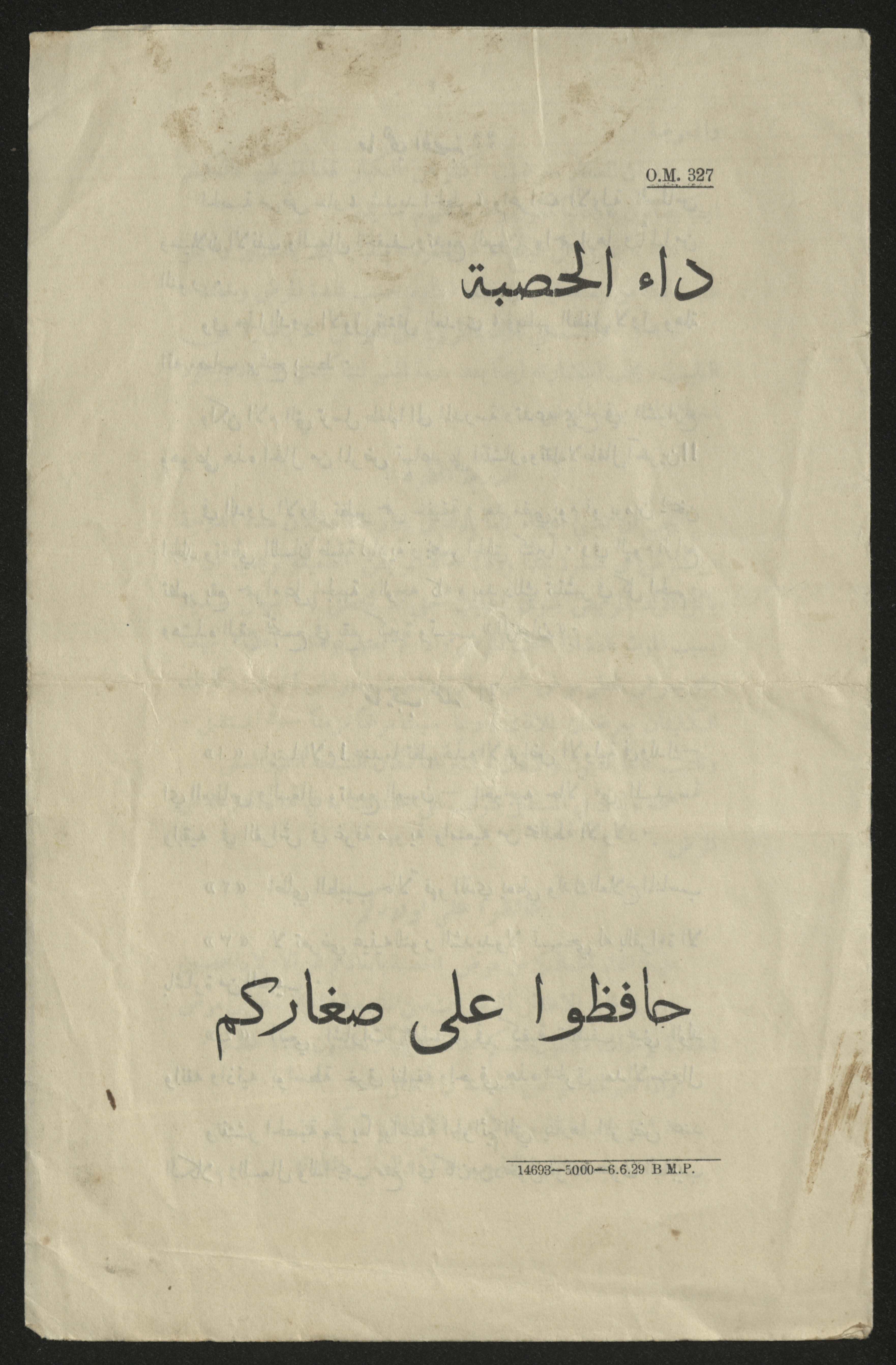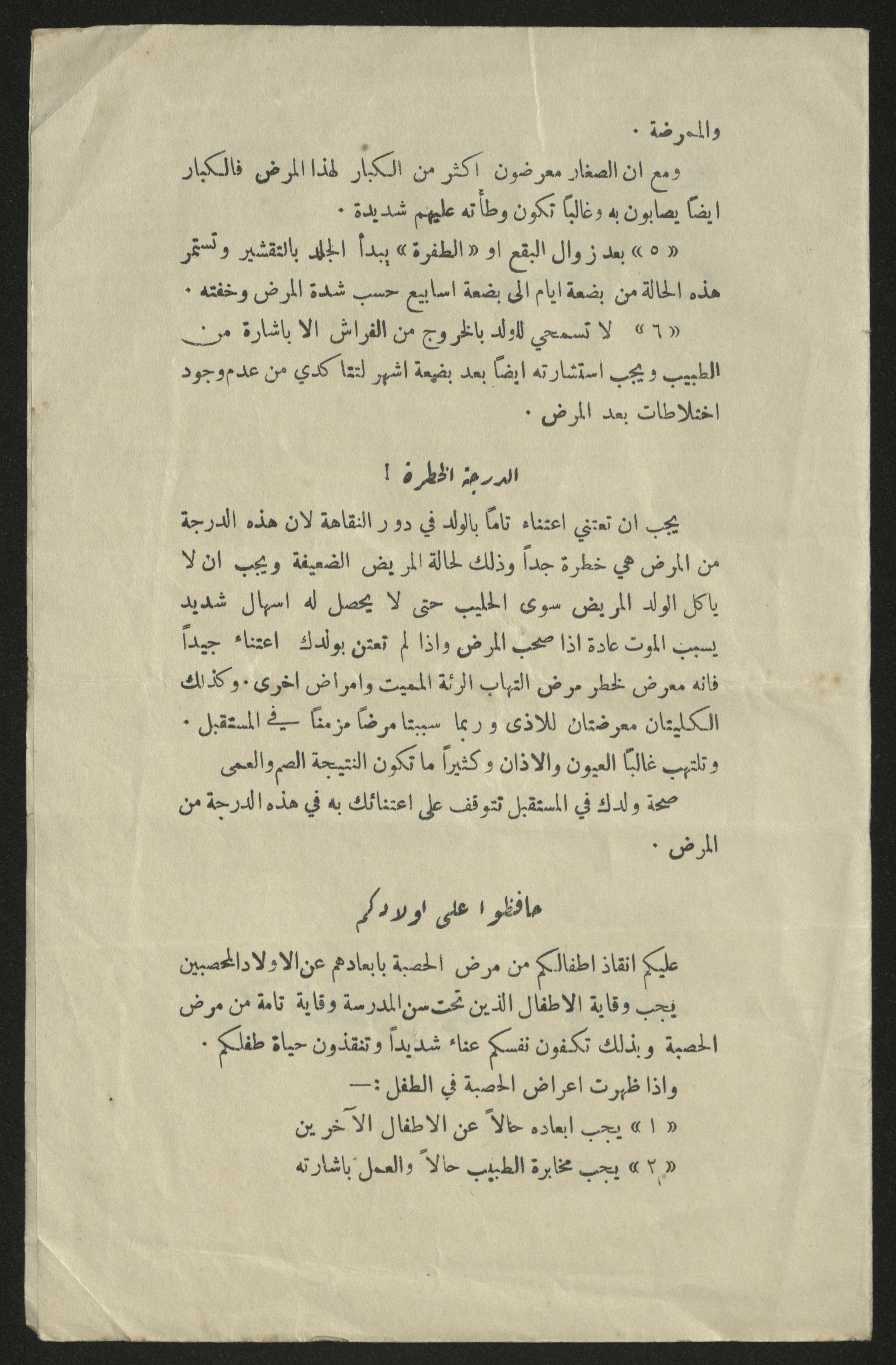 نشرة بعنوان "دائ الحصبة: حافظوا على صغاركم"، صادرة عن حكومة الانتداب البريطاني في فلسطين، في حزيران 1929.