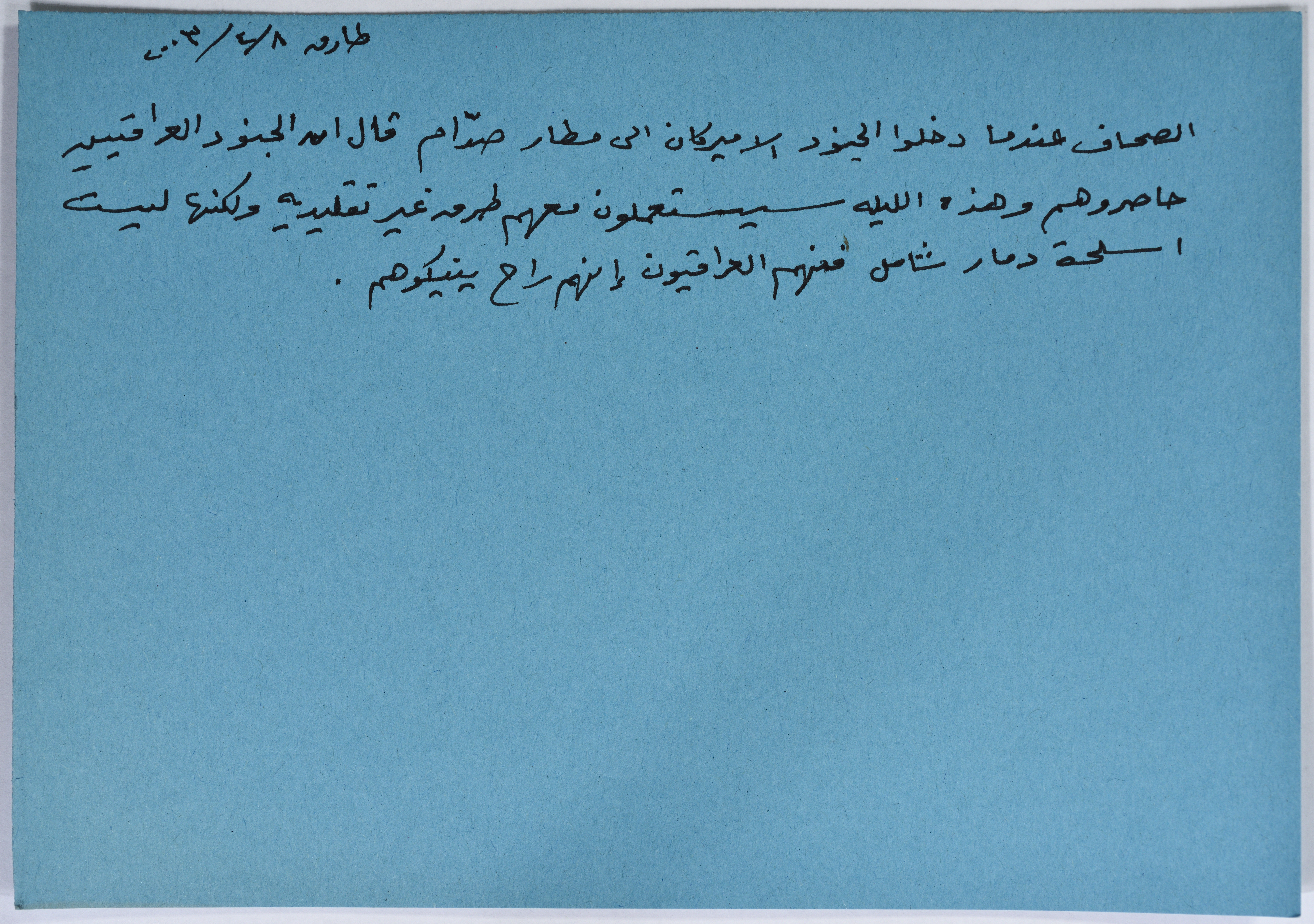 بطاقة وُثِّق عليها نكتة بعنوان الصحاف ومطار بغداد